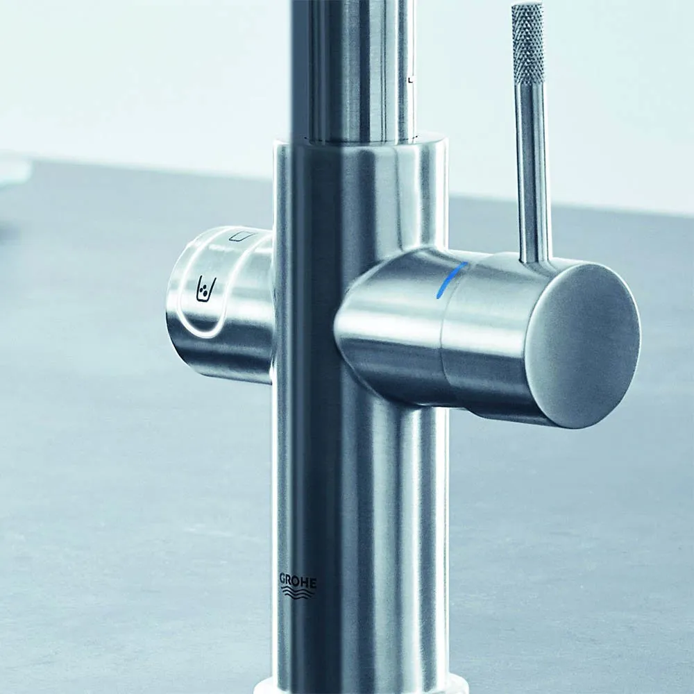 The Grohe RED Duo Instant Boiling Water Kitchen Tap is designed for modern homes that value speed, safety and convenience. This all-in-one system provides boiling, hot and cold water instantly, eliminating the need for a kettle and saving valuable time in the kitchen.