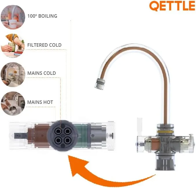 Upgrade your kitchen with the QETTLE Original 4-in-1 Instant Boiling Water Tap, a smart and versatile solution that delivers four types of water from one stylish fixture. This tap offers instant boiling water for tea, coffee and cooking, everyday hot and cold water for washing up, and filtered cold water for drinking — all without the need for multiple devices.